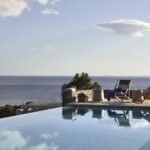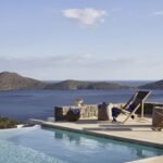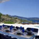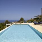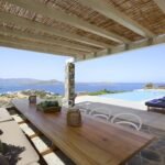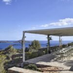 The two villas are 180 metres (or 590 feet) apart. They have total privacy due to their orientation, the site terrain and landscaping. Despite this, there is easy access between them. We offer various shaded dining areas in both villas. Among others, there is a lightweight pergola structure that can seat up to 34 guests at one long dining table and has stunning views towards the Mediterranean Sea.
