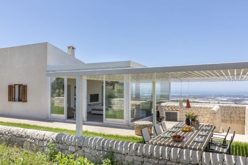 The Villa is on two levels. In the ground floor living room huge glass windows interweave with drystone walls, revealing wonderful views over the countryside to the sea and the splendid Castello di Donnafugata, a landscape that changes colour with the season and time of day. On a clear day you can see as far as Mount Etna and Malta. Opening off the living area is a well-equipped kitchen. Three of the bedrooms have double beds and ensuite bathrooms; the third is a twin with small bathroom and useful little laundry area.