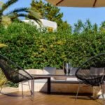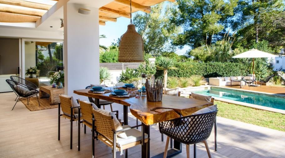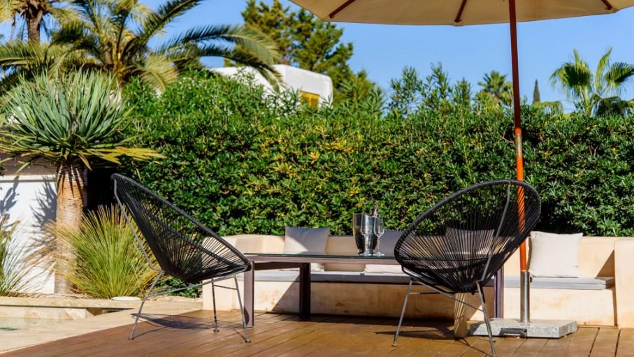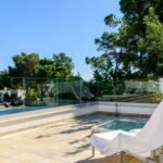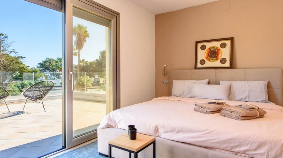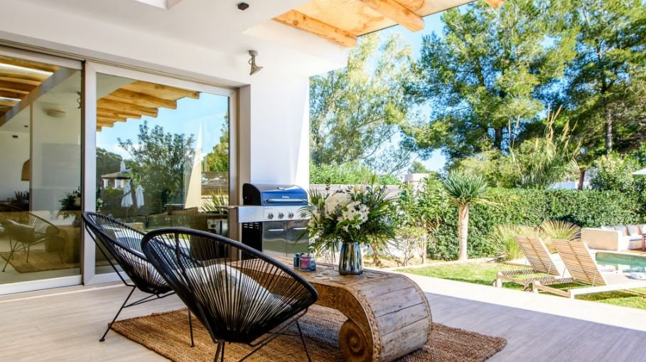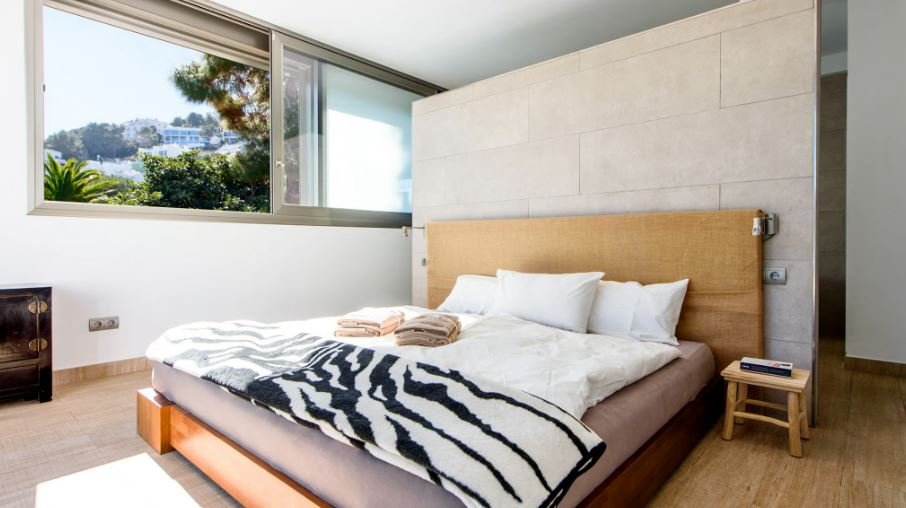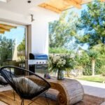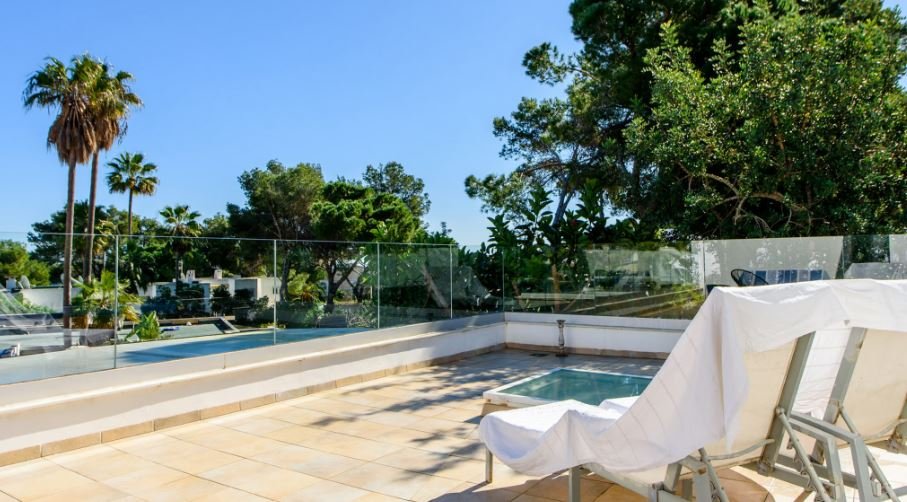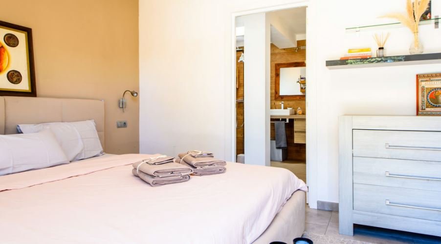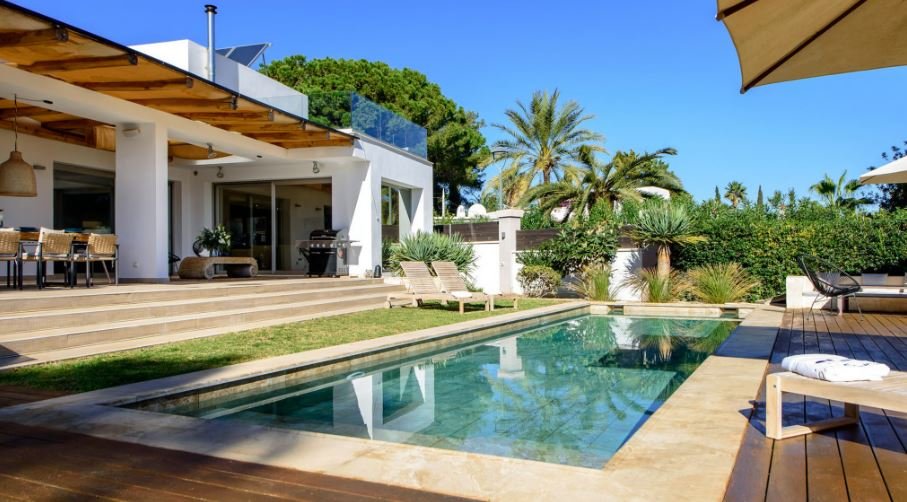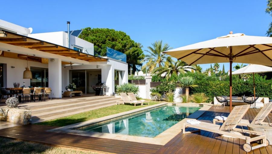 Wonderfully elegant, chic, modern and luxurious… the villa is certainly one of Ibiza’s most beautiful rentals. It’s a haven of greenery, where you can enjoy your Mediterranean vacation with family or friends in complete privacy. This 4-bedroom villa for rent is located in the small village of Siësta, east of Ibiza, just across the cove from the seaside resort of Santa Eulària des Riu. It’s a green, peaceful neighborhood with many large trees. The nearest beach is just a 5-minute walk away. Enjoy the relaxed atmosphere of the village, the warm island sun, the rest you deserve and return home completely refreshed. You’ll find a marina and numerous restaurants nearby.