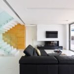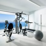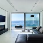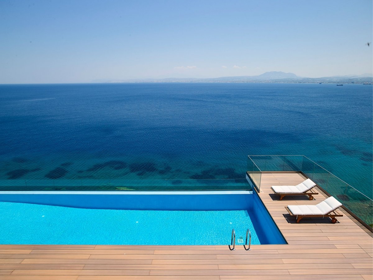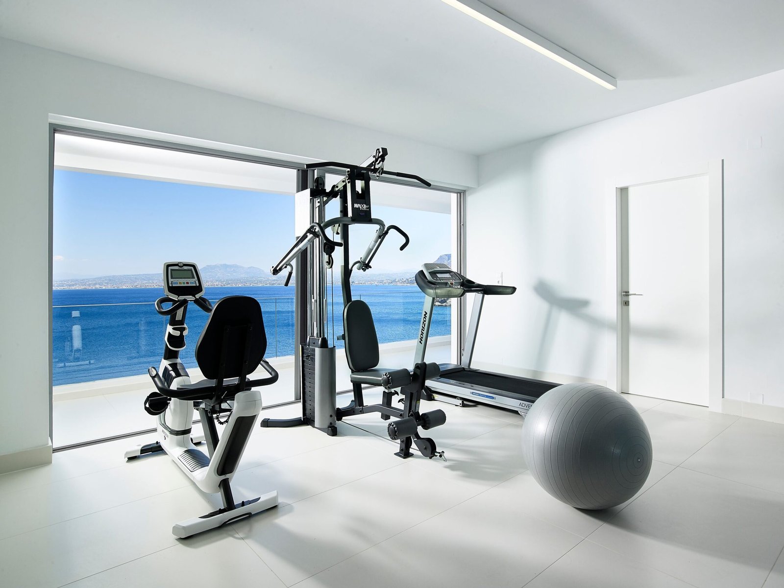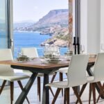 The middle floor is a ground level. When opening an entrance door, you will find a set of stairs that leads to the upper floor, where main bedroom area is located. Each bedroom has its own private entrance connected to the air conditioned gym area set up with a floor to ceiling windows. Here, while exercising, you can gaze at an endless blue of a Cretan Sea or admire a beautiful sunsets or moonrises above the blue horizon.